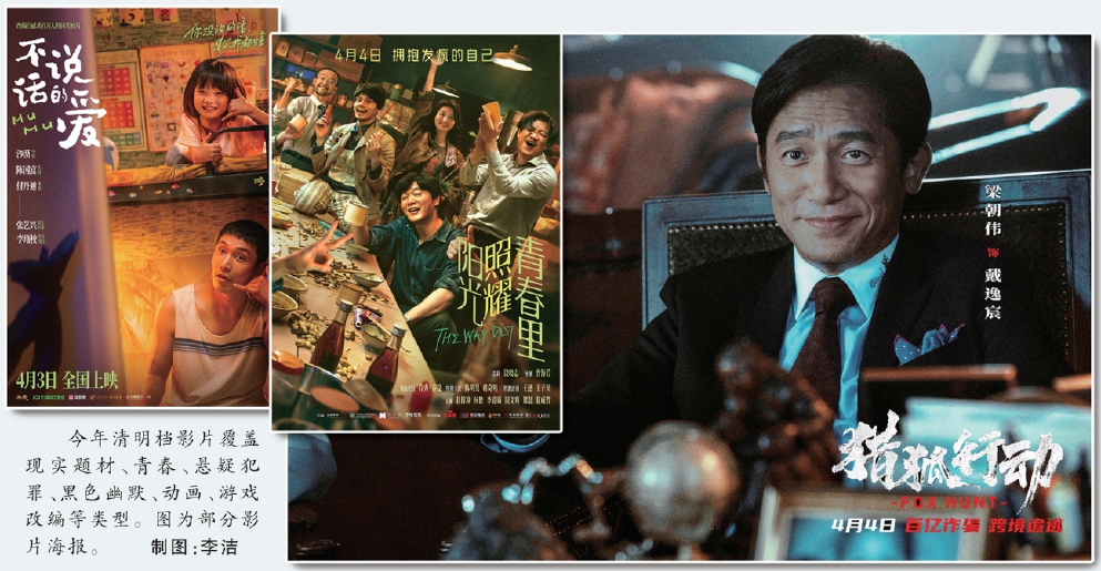 今年清明檔影片覆蓋現(xiàn)實(shí)題材、青春、懸疑犯罪、黑色幽默、動(dòng)畫、游戲改編等類型。圖為部分影片海報(bào)。 制圖:李潔