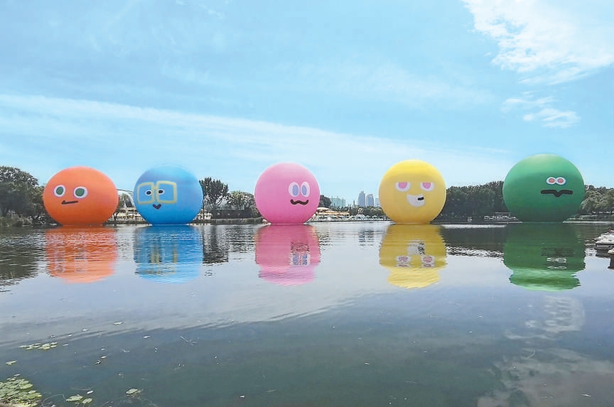 近日,朝陽公園北碼頭附近的湖面上新添五個(gè)10米高的充氣大球,粉色、黃色、綠色等不同顏色,對(duì)應(yīng)的是樂隊(duì)組合五月天的不同成員,也與今年7月25日至8月9日,五月天在鳥巢舉辦演唱會(huì)的舞臺(tái)裝置遙相呼應(yīng)。與此同時(shí),樂隊(duì)成員的人物公仔也分別放置在居庸關(guān)長(zhǎng)城、首鋼園、鼓樓廣場(chǎng)、798·751藝術(shù)區(qū)、亮馬河畔等地標(biāo)景點(diǎn)。