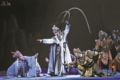此外,該劇還利用舞臺(tái)技術(shù)突破了傳統(tǒng)戲曲的節(jié)奏,使之更為緊湊連貫。比如白骨精定下計(jì)謀要去偵探唐僧情況時(shí),舞臺(tái)光暗,一個(gè)發(fā)光小球飛升直達(dá)天幕,暗示白骨精元神飛出洞府,同時(shí)伴有類似影視音效作為烘托;而在唐僧狠心驅(qū)逐孫悟空時(shí),孫悟空向八戒沙僧交代完后,從上場(chǎng)門下場(chǎng),后場(chǎng)馬上就安排一個(gè)孫悟空替身吊威亞從上場(chǎng)口飛到下場(chǎng)口,過程連貫自然,這都是受到電影藝術(shù)啟發(fā)的創(chuàng)新。