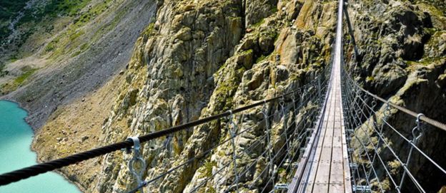 在所有懸索橋中,最令人驚心動魄的應該就是特里夫特懸索橋了。該橋長170米,跨伯爾尼高地的特里夫特斯湖,湖面與橋之間無任何連接,湖光山色冰川美景盡收眼底,每年吸引著成千上萬名渡橋者前來游覽。