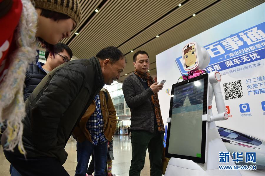 2月1日,旅客們在廣州南站與智能機器人“小璐”對話。當日,一臺名叫“小璐”的智能機器人亮相廣州南站,吸引了大批旅客的圍觀,大家紛紛嘗試與“小璐”對話,向她咨詢列車時刻、購票信息、天氣情況等問題,“小璐”不僅可以用甜美的女聲一一作答,還可以在接收到語音指令后,為旅客“唱歌”和“跳舞”。據(jù)了解,使用智能機器人服務旅客是廣州南站在今年春運中的新嘗試,如果試用效果良好,今后有望在車站中看到更多智能機器人的身影。新華社記者 梁旭 攝
