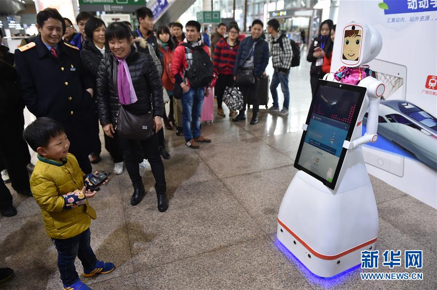 2月1日,旅客們在廣州南站與智能機(jī)器人“小璐”對話。當(dāng)日,一臺名叫“小璐”的智能機(jī)器人亮相廣州南站,吸引了大批旅客的圍觀,大家紛紛嘗試與“小璐”對話,向她咨詢列車時(shí)刻、購票信息、天氣情況等問題,“小璐”不僅可以用甜美的女聲一一作答,還可以在接收到語音指令后,為旅客“唱歌”和“跳舞”。據(jù)了解,使用智能機(jī)器人服務(wù)旅客是廣州南站在今年春運(yùn)中的新嘗試,如果試用效果良好,今后有望在車站中看到更多智能機(jī)器人的身影。新華社記者 梁旭 攝