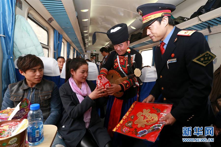2月1日,彝族藝術(shù)家在K165次列車上為旅客表演。當(dāng)日,在西安鐵路局西安至昆明的K165次列車上,四川美姑縣原生態(tài)畢摩樂隊與西安客運(yùn)段職工民樂小分隊聯(lián)合舉辦“英雄列車民族之聲親情溫暖回家路”音樂會,畢摩樂隊用口弦、哈門、木葉、瑪布等彝族民間樂器演奏的音樂為返鄉(xiāng)過年的旅客提前送上新年祝福。民間藝術(shù)家和列車乘務(wù)員還為旅客們送上“?!弊?、春聯(lián)。新華社發(fā)