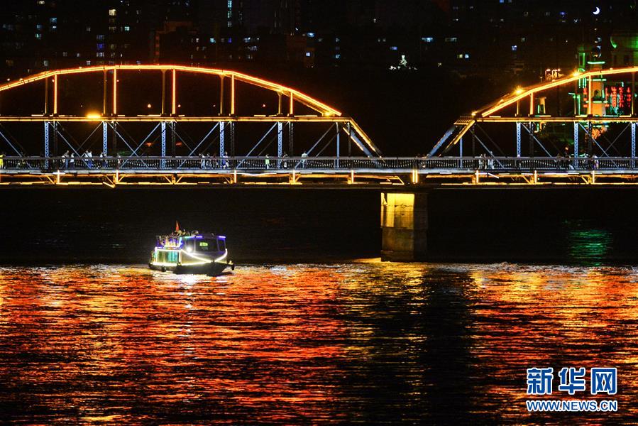 6月14日,一艘游輪從黃河蘭州段中山橋下穿過。自6月12日起,蘭州黃河游輪夏季夜航航線正式開通。據(jù)了解,作為黃河蘭州段水上旅游重點(diǎn)線路,該航線由蘭州市城關(guān)區(qū)蘭州港碼頭和白塔山碼頭始發(fā),每晚20時起開行,全程約6公里,運(yùn)行時長50分鐘左右。游客可以乘坐豪華游輪欣賞黃河夜景,感受蘭州黃河風(fēng)情線別樣魅力。新華社記者 陳斌 攝