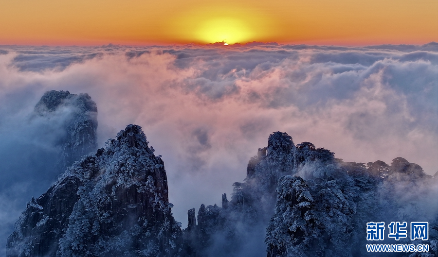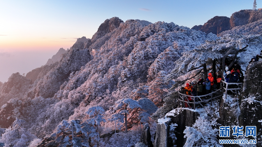 近日,安徽黃山雪后初霽,山峰銀裝素裹,滿(mǎn)目玉樹(shù)瓊枝。云霧如同舞者般在白雪皚皚的峰巒間穿梭嬉戲,宛如一幅渾然天成的水墨丹青。