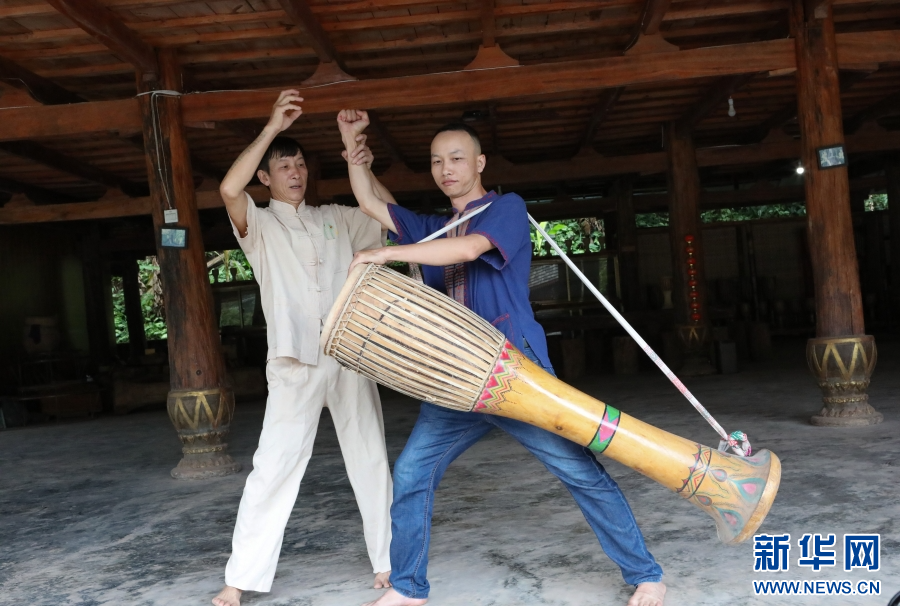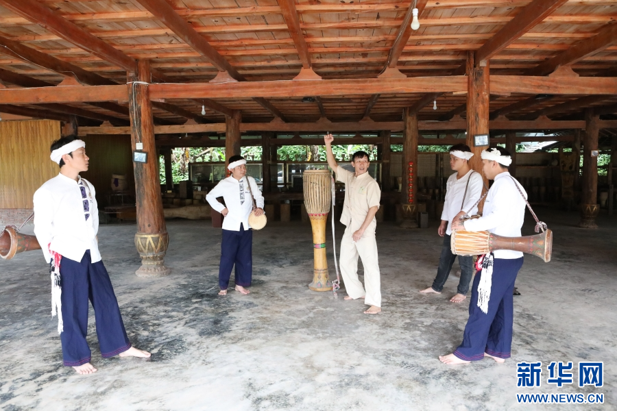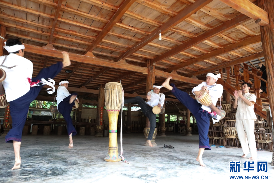 8月16日,波罕丙(右一)帶領(lǐng)徒弟練習象腳鼓舞。新華網(wǎng)發(fā)(李云生 攝)