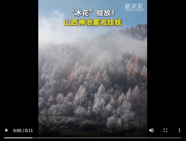 初冬時節(jié),山西神池國家登山步道出現(xiàn)霧凇景觀。金色的樹枝上掛滿冰晶,微風(fēng)徐來,霧凇輕盈搖曳,還有牛羊在山坡上悠閑地吃草。霧凇宛如一層白色的薄紗,將整個森林籠罩其間,如夢如幻。