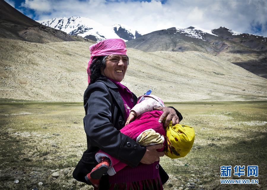 在帕米爾高原瓦罕走廊,一位牧民抱著孫子去親戚家串門(6月4日攝)。6月的帕米爾高原風光旖旎,吸引國內(nèi)外大量游客前來領(lǐng)略它的神韻。 新華社記者 趙戈 攝