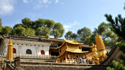顯通寺的大雄寶殿為舉行佛事活動(dòng)主要場所,是顯通寺的第三重大殿,殿內(nèi)供著三尊佛像:中是釋迦牟尼佛,西是阿彌陀佛,東是藥師佛;兩旁有十八羅漢像背后有觀音、文殊、普賢三尊菩薩像。觀音殿殿內(nèi),中間供著觀音菩薩像,左右供著文殊和普賢菩薩像。大文殊殿,是顯通寺的第二重大殿。大文殊殿內(nèi),供著七尊文殊菩薩像:正中的為大智文殊;前面的五位,從左至右,依次為西臺(tái)獅子文殊,南臺(tái)智慧文殊,中臺(tái)孺者文殊,北臺(tái)無垢文殊,東臺(tái)聰明文殊;大智文殊后面是甘露文殊。文殊像前有護(hù)法神韋馱像,兩側(cè)有十八羅漢像。