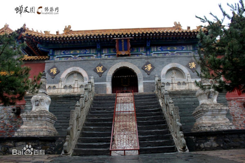 全寺占地四十五畝,順山就勢而筑殿宇,布局嚴(yán)謹(jǐn)。寺前有石階一百零八級。山門內(nèi)有天王殿、鐘鼓樓、大雄寶殿等建筑。各殿均用三彩琉璃瓦覆蓋。又,寺內(nèi)有康熙御碑,方座螭首,矗立在前院;乾隆御碑在東禪院碑亭內(nèi),以方形巨石雕成,高六公尺,每面寬一公尺,上刻漢、滿、蒙、藏四種文字。
