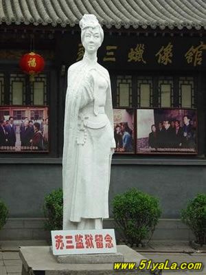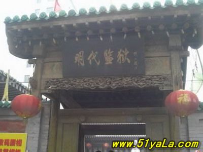 “蘇三監(jiān)獄”在今洪洞縣政府院內(nèi)西南,亦即明洪洞縣衙西南角。一進(jìn)掛有“明代監(jiān)獄”匾額的大門(mén),首先看到的便是蘇三的塑像,外院當(dāng)年監(jiān)獄的辦公場(chǎng)所,右邊的院落是普通監(jiān)牢,中間是過(guò)道,兩邊共有監(jiān)牢十余間,過(guò)道頂上布有鐵絲網(wǎng),網(wǎng)上掛有銅鈴,一有犯人企圖越墻逃跑,便會(huì)觸響銅鈴。過(guò)道的盡頭,正對(duì)的是獄卒的值班室,右面的墻上有獄神的供位,傳說(shuō)當(dāng)年囚犯入獄都要參拜獄神,就是獄神下面的墻基處,有一小洞,是當(dāng)年運(yùn)送尸體的出口,犯人在獄中病死或是被打死,是不能從大門(mén)抬出去的,只能從這個(gè)小洞拉出去。過(guò)道盡頭的左邊,便是死囚牢的大門(mén),死囚牢雙門(mén)雙墻,門(mén)上畫(huà)有狴犴,狴犴是龍的兒子,長(zhǎng)得卻象老虎,因此人們誤稱為“虎頭牢”,大約是因?yàn)辇埳抛?,子子不同,狴犴專門(mén)掌管刑獄,大門(mén)只有一米六高,所有進(jìn)入死囚牢的人都要在狴犴像前低頭,顯示對(duì)法律的敬畏。進(jìn)了門(mén)洞,里面還有一道門(mén),而這兩道門(mén)卻是一扇從右開(kāi),一扇從左開(kāi),不明就里的囚犯如果越獄,往往出了第一道門(mén)卻怎么也打不開(kāi)第二道門(mén),一個(gè)小小的改動(dòng)就能起到拖延犯人越獄時(shí)間的作用,不能不佩服古人的智慧。進(jìn)入死牢院,右面是一堵高墻,左面就是當(dāng)年關(guān)押蘇三的牢房,里面有蘇三的塑像。死囚院的中央還有當(dāng)年蘇三坐監(jiān)時(shí)洗衣的水井和石槽,井口留有一道道繩索磨下的印記,井口只有半尺多寬,這是為了防止死囚投井自殺。據(jù)說(shuō),右面的高墻里灌裝的都是流沙,如果犯人想要挖墻越獄,流沙便會(huì)從挖開(kāi)的小口中源源不斷地流來(lái),使其難以挖通圍墻。1964年我國(guó)著名考古學(xué)家王冶秋先生曾在洪洞考察確認(rèn),蘇三監(jiān)獄為我國(guó)罕見(jiàn)的明代監(jiān)獄,并題詩(shī)曰:“虎頭牢里羈紅妝,一曲攪亂臭水漿。王三公子今何在?此處空留丈八墻。”十年動(dòng)亂期間,蘇三監(jiān)獄被拆毀。為了使“蘇三監(jiān)獄”這一僅存的明代監(jiān)獄得以保留,洪洞縣人民政府后做出了修復(fù)“明代蘇三監(jiān)獄”的決定。修復(fù)事宜于1984年5月開(kāi)始,同年10月竣工。