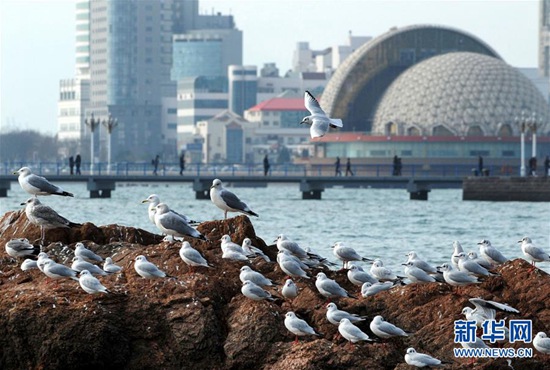 一群海鷗在青島棧橋景區(qū)附近的礁石上歇息(12月28日攝)。