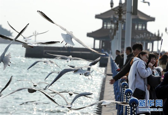 12月28日,游客在青島棧橋景區(qū)觀賞海鷗。