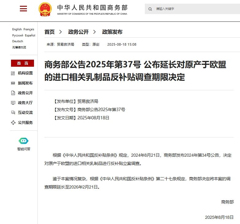 商務(wù)部公告2025年第37號 公布延長對原產(chǎn)于歐盟的進(jìn)口相關(guān)乳制品反補(bǔ)貼調(diào)查期限決定 根據(jù)《中華人民共和國反補(bǔ)貼條例》規(guī)定,2024年8月21日,商務(wù)部發(fā)布2024年第34號公告,決定對原產(chǎn)于歐盟的進(jìn)口相關(guān)乳制品進(jìn)行反補(bǔ)貼立案調(diào)查。 鑒于本案情況復(fù)雜,根據(jù)《中華人民共和國反補(bǔ)貼條例》第二十七條規(guī)定,商務(wù)部決定將本案的調(diào)查期限延長至2026年2月21日。 商務(wù)部 2025年8月18日