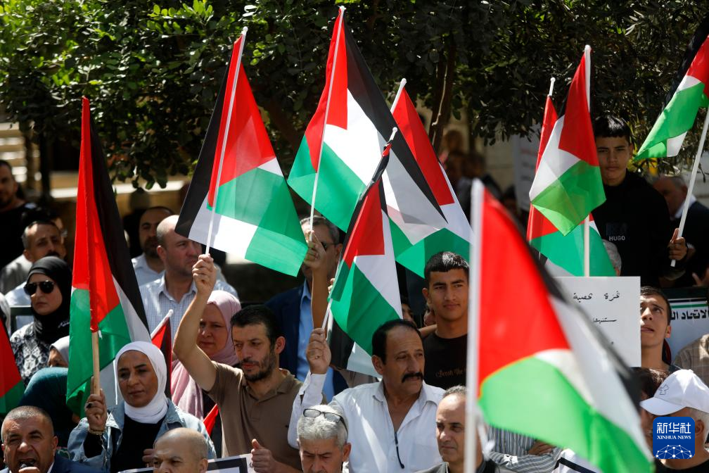 ??9月23日,在約旦河西岸城市希伯倫,民眾揮舞巴勒斯坦旗幟參加慶?;顒?dòng)。新華社發(fā)(馬蒙·沃茲沃茲攝)
