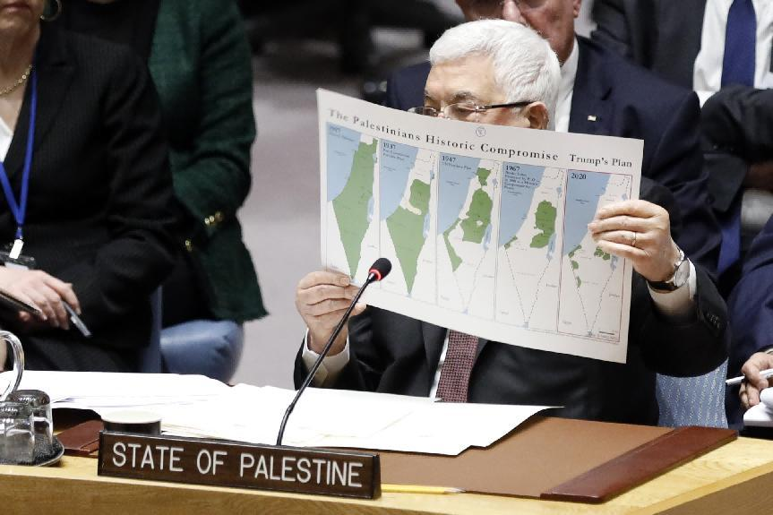 ??2020年2月11日,在位于紐約的聯(lián)合國總部,巴勒斯坦總統(tǒng)阿巴斯在安理會(huì)中東局勢(shì)和巴勒斯坦問題公開會(huì)上手持地圖發(fā)言。 新華社記者 李木子 攝