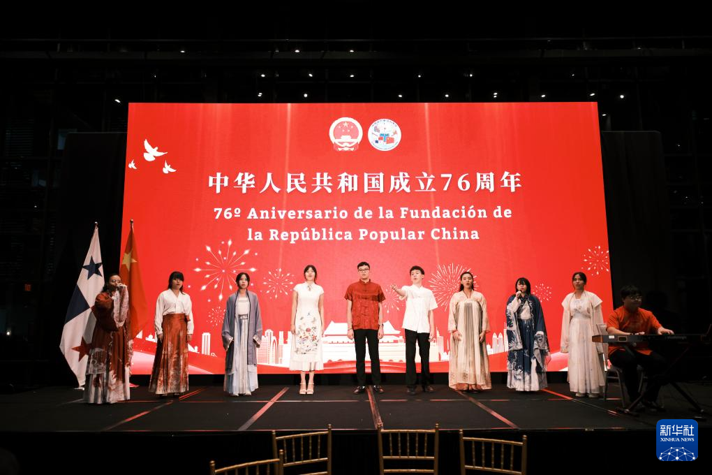 9月22日,在巴拿馬首都巴拿馬城,當(dāng)?shù)厍嗄暝趹c祝中華人民共和國成立76周年招待會上合唱中文歌曲。新華社記者 許詠政 攝 巴拿馬農(nóng)業(yè)發(fā)展部長利納雷斯說,76年來,中國在經(jīng)濟(jì)發(fā)展、科技創(chuàng)新和脫貧攻堅(jiān)等方面取得巨大成就。巴中建交時(shí)間雖短,但友誼堅(jiān)實(shí)穩(wěn)固。中國已成為巴重要的朋友,巴中關(guān)系對巴經(jīng)濟(jì)社會發(fā)展有重要積極影響。巴方愿同中方進(jìn)一步加強(qiáng)高層對話。