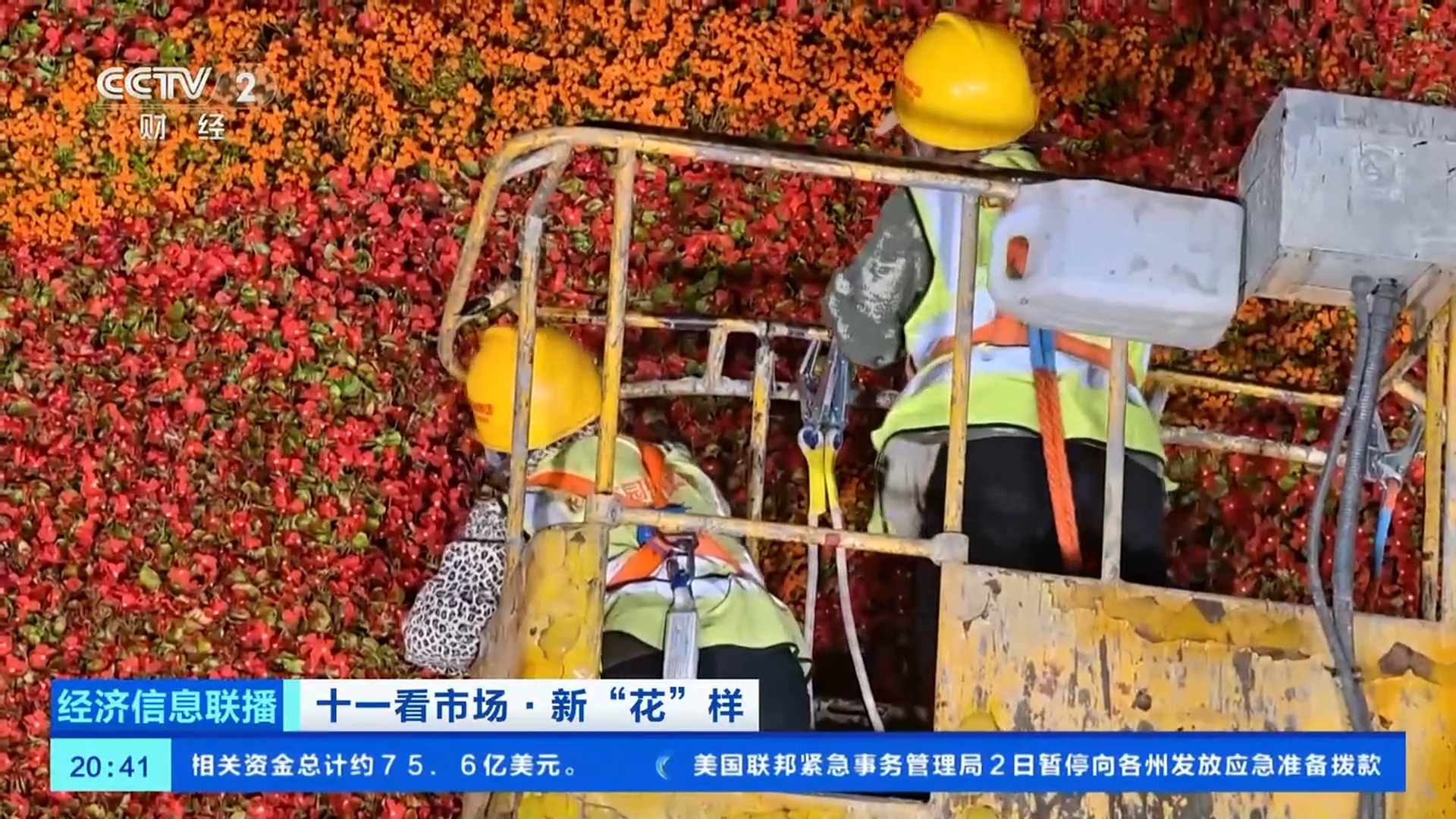 總臺央視記者 王聞聰:今年北京天安門廣場中心花壇的大花籃和長安街沿線的10組立體花壇,都在國慶中秋假期增添了夜間照明設(shè)施,讓夜晚的花壇更加引人注目。北京東單東南角的“黃河贊歌”立體花壇,也被稱為是“會唱歌的花壇”。在花壇上不僅能看到微觀的壺口瀑布、奔騰的駿馬、載歌載舞的人群,還有水霧、音樂等聲光電技術(shù),更加逼真地還原了黃河之水天上來的氣勢。晚上八點,這里仍有大量游客前來拍照打卡。