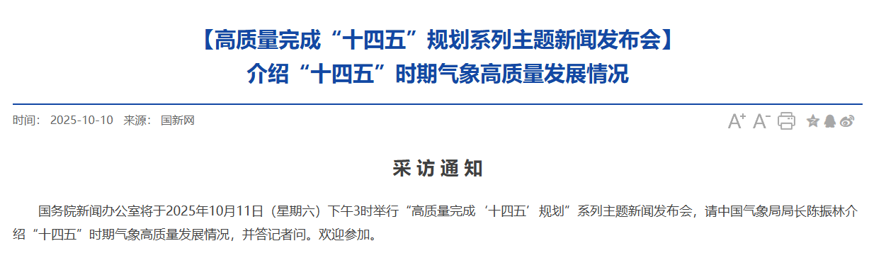 國務(wù)院新聞辦公室將于2025年10月11日(星期六)下午3時(shí)舉行“高質(zhì)量完成‘十四五’規(guī)劃”系列主題新聞發(fā)布會(huì),請(qǐng)中國氣象局局長陳振林介紹“十四五”時(shí)期氣象高質(zhì)量發(fā)展情況,并答記者問。