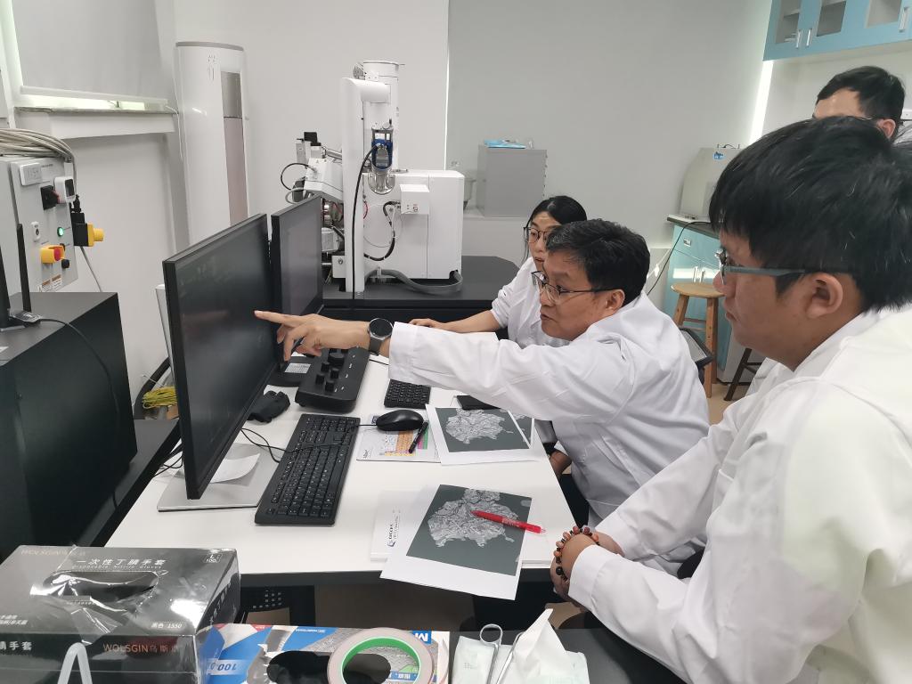 2024年8月26日,徐義剛院士與團(tuán)隊成員通過掃描電鏡觀察嫦娥六號樣品特征。(中國科學(xué)院廣州地球化學(xué)研究所供圖)