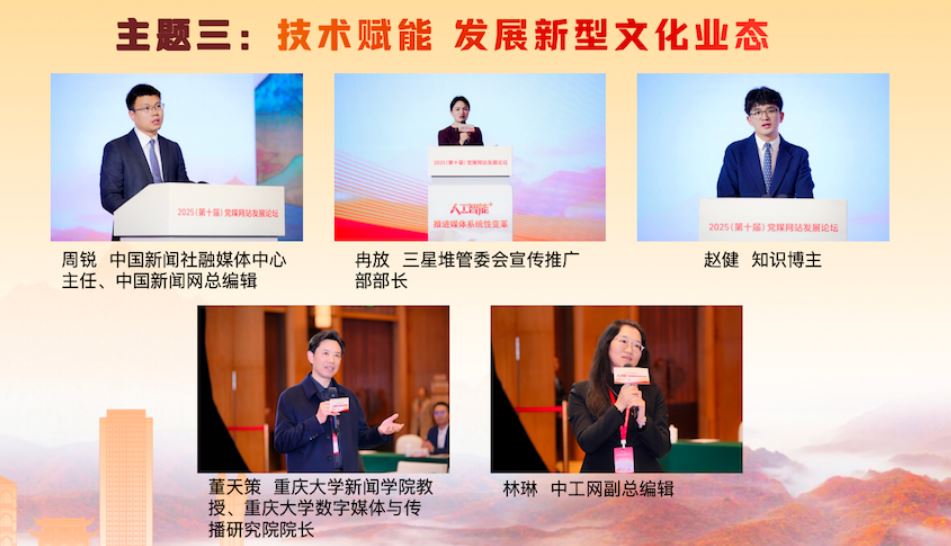 在“技術(shù)賦能 發(fā)展新型文化業(yè)態(tài)”主題研討環(huán)節(jié),中國新聞社融媒體中心主任、中國新聞網(wǎng)總編輯周銳,三星堆管委會宣傳推廣部部長冉放,知識博主趙健,分別就技術(shù)賦能中華文化“破圈”出海、三星堆文化傳播數(shù)智實(shí)踐、短視頻文化傳播等方面的經(jīng)驗(yàn)成果進(jìn)行了精彩展示。重慶大學(xué)新聞學(xué)院教授、重慶大學(xué)數(shù)字媒體與傳播研究院院長董天策,中工網(wǎng)副總編輯林琳作為互動(dòng)嘉賓進(jìn)行了點(diǎn)評,期待主流媒體發(fā)揮傳播實(shí)踐智慧,在內(nèi)容、技術(shù)和社會責(zé)任之間找到平衡,鑄造中華文化新輝煌。