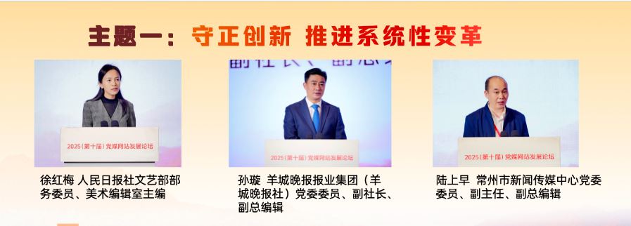 在“守正創(chuàng)新 推進(jìn)系統(tǒng)性變革”主題研討環(huán)節(jié),人民日報(bào)社文藝部部務(wù)委員、美術(shù)編輯室主編徐紅梅,羊城晚報(bào)報(bào)業(yè)集團(tuán)(羊城晚報(bào)社)黨委委員、副社長、副總編輯孫璇,常州市新聞傳媒中心黨委委員、副主任、副總編輯陸上早分別作主旨發(fā)言,介紹了各自領(lǐng)域推進(jìn)系統(tǒng)性變革、發(fā)展新時(shí)代中國特色社會主義文化的實(shí)踐與探索。徐紅梅表示,“每日讀畫”采取“AI+美術(shù)”“微視頻+夜讀”的形式,堅(jiān)持“讀準(zhǔn)、讀細(xì)、讀新、讀美”,讓AI成為深入畫境、開啟古今對話的共創(chuàng)者,以動(dòng)態(tài)轉(zhuǎn)譯、意境擴(kuò)展、流程再造、視聽融合開發(fā)美術(shù)融媒的敘事潛能,深入挖掘中華文明賡續(xù)傳承的基因密碼,成為探索主流媒體系統(tǒng)性變革的微觀樣本。孫璇表示,羊城晚報(bào)全面啟動(dòng)系統(tǒng)性變革,以做強(qiáng)媒體、文化、數(shù)據(jù)、產(chǎn)業(yè)四個(gè)戰(zhàn)略板塊為重點(diǎn),把“技術(shù)賦能”嵌入系統(tǒng)性變革各關(guān)鍵板塊,積極增強(qiáng)文化傳播、促進(jìn)文化交流和繁榮文化生產(chǎn)。陸上早表示,常州借“蘇超”東風(fēng),走出城市轉(zhuǎn)型與能級躍升之路。改革的推進(jìn)需聚焦六大方向:組織體系化,內(nèi)容精品化,傳播移動(dòng)化,技術(shù)現(xiàn)代化,分配績效化,干部年輕化。