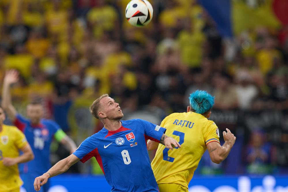 6月26日,斯洛伐克隊(duì)球員奧德·杜達(dá)(左)與羅馬尼亞隊(duì)球員安德烈·拉蒂烏在比賽中拼搶。新華社記者 孟鼎博 攝