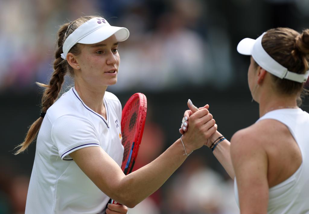 7月10日,萊巴金娜(左)和斯維托麗娜在比賽后相互致意。新華社記者 李穎 攝
