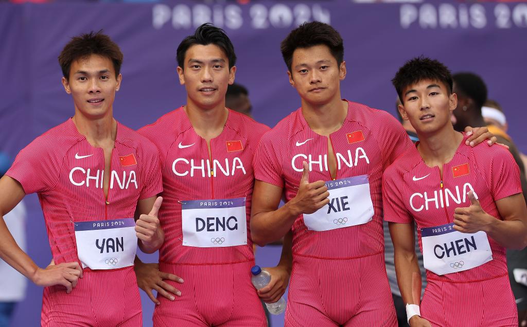 8月8日,中國隊(duì)選手陳佳鵬、謝震業(yè)、鄧智艦、嚴(yán)海濱(從右至左)在比賽后。新華社記者 李明 攝