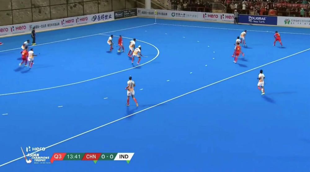 第二節(jié),面對(duì)印度隊(duì)的強(qiáng)勢(shì)進(jìn)攻,中國(guó)隊(duì)幾次成功搶斷,場(chǎng)面十分膠著。第三節(jié),印度隊(duì)在禁區(qū)內(nèi)攔球犯規(guī),中國(guó)隊(duì)獲得短角球,然而在印度隊(duì)嚴(yán)密的防守下射偏。隨著比賽的進(jìn)行,中國(guó)隊(duì)隊(duì)員體力有所下降,但依然在場(chǎng)上頑強(qiáng)拼搏。第四節(jié),印度隊(duì)通過(guò)團(tuán)隊(duì)配合取得進(jìn)球,中國(guó)隊(duì)調(diào)整戰(zhàn)術(shù),將守門員換下,全力進(jìn)攻,但未能扭轉(zhuǎn)局勢(shì),最終以0:1惜敗。