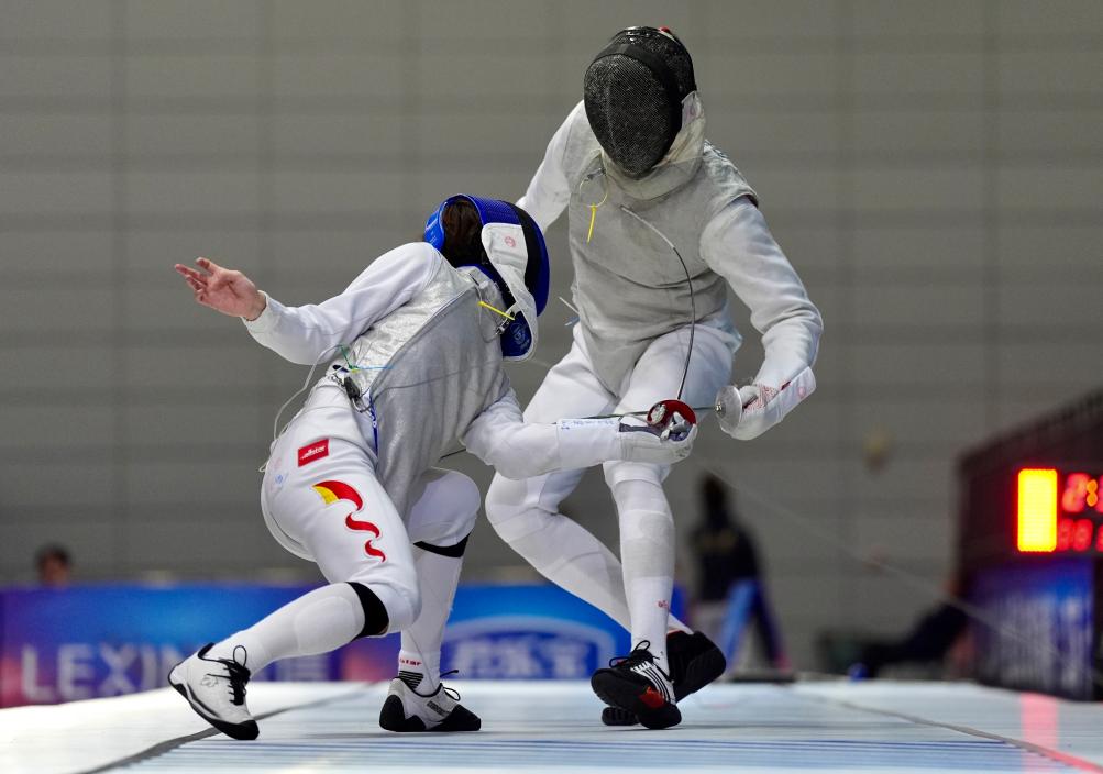 沈晨鵬(左)在男佩團(tuán)體決賽中