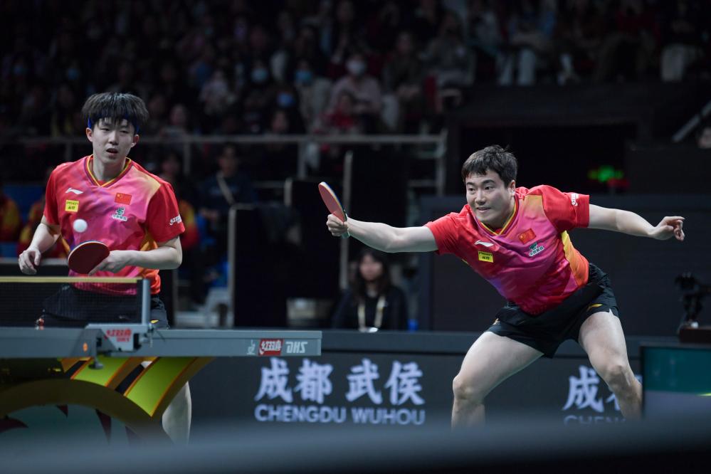 12月5日,中國(guó)隊(duì)組合王楚欽/梁靖崑(右)在男雙比賽中。新華社記者 王曦 攝