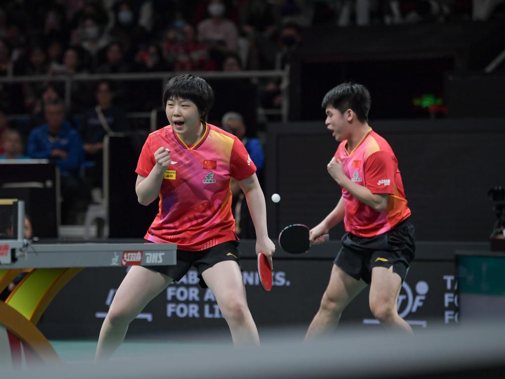 12月5日,中國(guó)隊(duì)組合王楚欽(左)/孫穎莎在混雙比賽中。新華社記者 江宏景 攝
