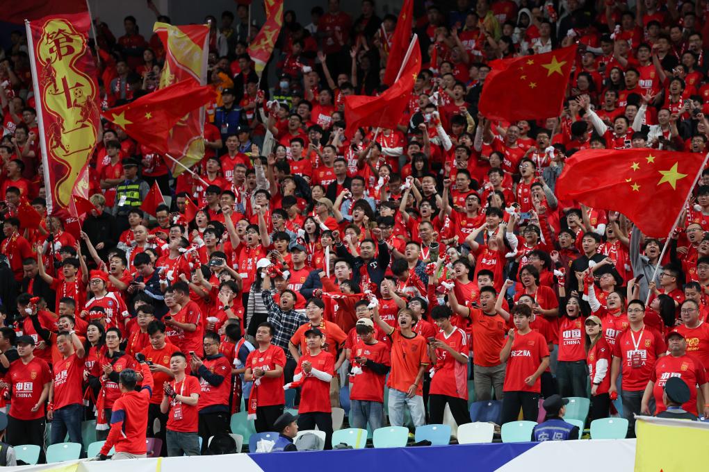 11月19日,球迷慶祝中國隊(duì)進(jìn)球。當(dāng)日,在福建廈門舉行的2026美加墨世界杯亞洲區(qū)預(yù)選賽18強(qiáng)賽第六輪比賽中,中國隊(duì)主場(chǎng)對(duì)陣日本隊(duì)。新華社記者 胡星宇 攝