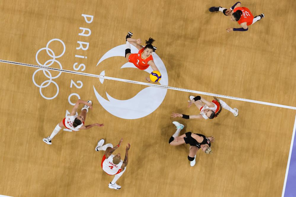 7月29日,中國女排在巴黎奧運(yùn)會(huì)女排小組賽對(duì)陣美國隊(duì)的比賽中。新華社記者 李鋼 攝