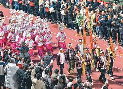 1月4日,發(fā)源于貴州省黔東南苗族侗族自治州榕江縣的“村超”正式拉開第三屆賽事的序幕。圖為拉拉隊(duì)參加入場(chǎng)巡游。新華社記者 楊文斌攝