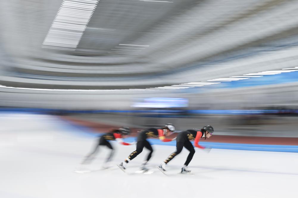 2024年12月15日,2024-2025賽季中國(guó)杯速度滑冰精英聯(lián)賽第四站暨亞冬會(huì)測(cè)試賽女子團(tuán)體追逐比賽在黑龍江省冰上訓(xùn)練中心舉行。新華社記者 張濤 攝