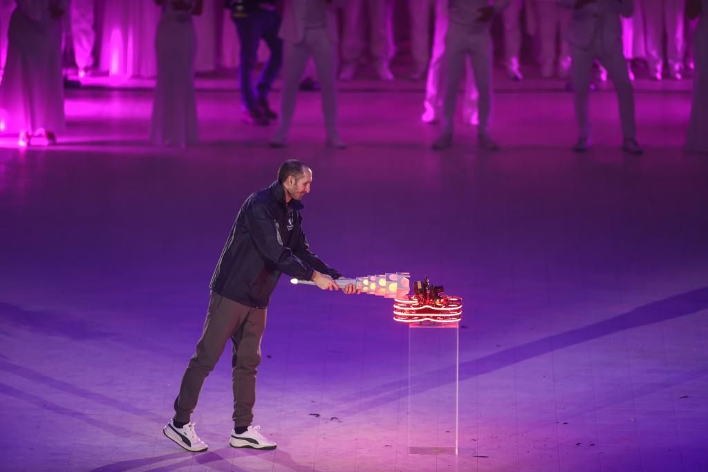 意大利體育和青年部長安德烈亞·阿博迪出席開幕式并宣布運動會開幕。在充滿風情的歌舞、魔術(shù)和雜技表演后,意大利足球名宿基耶利尼手持火炬,將一臺無人機“激活”。隨后,發(fā)光的無人機從奧林匹克體育館飛向都靈王宮,將矗立在王宮前的主火炬點亮。