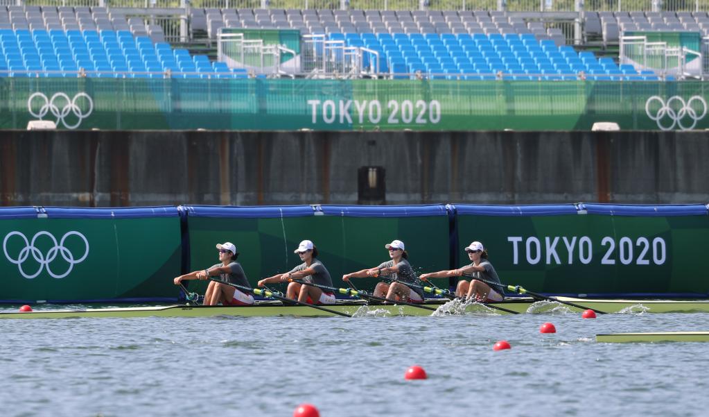 2021年7月20日,中國賽艇隊(duì)女子四人雙槳隊(duì)員在訓(xùn)練中。當(dāng)日,中國賽艇隊(duì)在日本東京海之森水上競技場訓(xùn)練,備戰(zhàn)即將開幕的東京奧運(yùn)會(huì)。新華社記者 杜瀟逸 攝