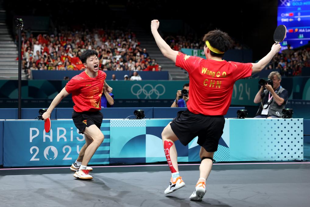 2024年8月9日,中國隊(duì)組合馬龍(左)/王楚欽慶祝勝利。當(dāng)日,在巴黎奧運(yùn)會(huì)乒乓球男團(tuán)金牌賽中,中國隊(duì)?wèi)?zhàn)勝瑞典隊(duì),獲得冠軍。新華社記者 劉續(xù) 攝