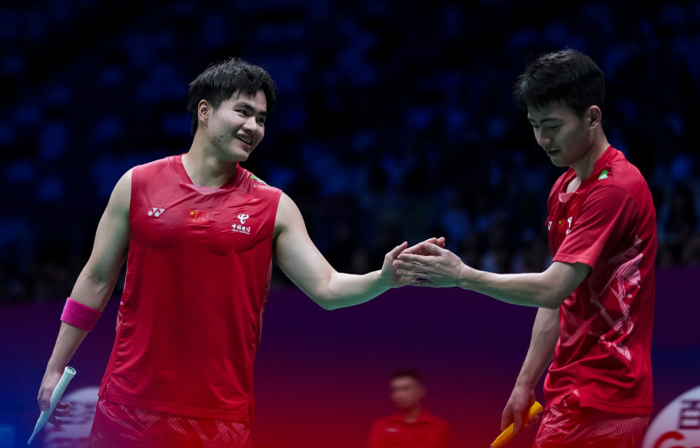 4月28日,中國隊組合梁偉鏗(左)/王昶在男雙比賽中慶祝得分。最終,梁偉鏗/王昶2:0戰(zhàn)勝中國香港隊組合洪魁駿/呂俊瑋。新華社記者 孫非 攝