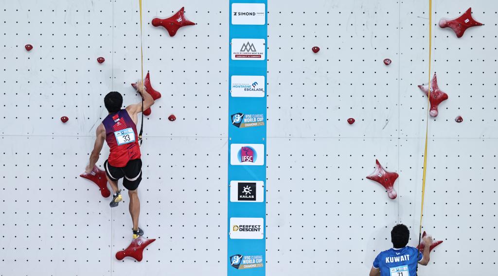 7月11日,中國選手龍見國(左)在2025攀巖世界杯霞慕尼站男子速度賽中。新華社記者 高靜 攝