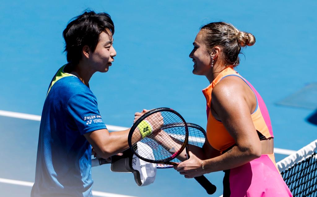 1月21日,中國選手白卓璇(左)與白俄羅斯選手薩巴倫卡賽后握手致意。新華社記者 馬平 攝