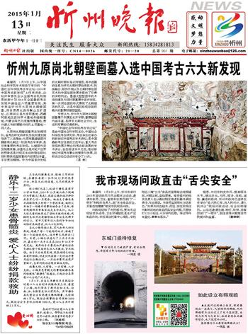2015年1月9日上午,從中國社會科學(xué)院學(xué)術(shù)報告廳舉行的“中國社會科學(xué)院考古學(xué)論壇·2014年中國考古新發(fā)現(xiàn)”上傳來消息,論壇評審委員會從全國考古機構(gòu)推薦的數(shù)十項2014年全國最新考古發(fā)現(xiàn)中遴選出六項重要發(fā)現(xiàn),其中忻州市九原崗北朝壁畫墓,同甘肅肅北縣馬鬃山玉礦遺址、云南祥云縣大波那墓地、西藏阿里地區(qū)故如甲木墓地和曲踏墓地、內(nèi)蒙古陳巴爾虎旗崗嘎墓地、貴州遵義市新蒲播州楊氏土司墓地一同入選。