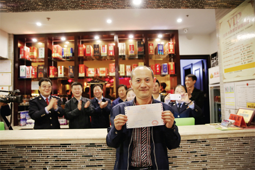 原平市王府甲魚城負責人展示開出的“1 號票”