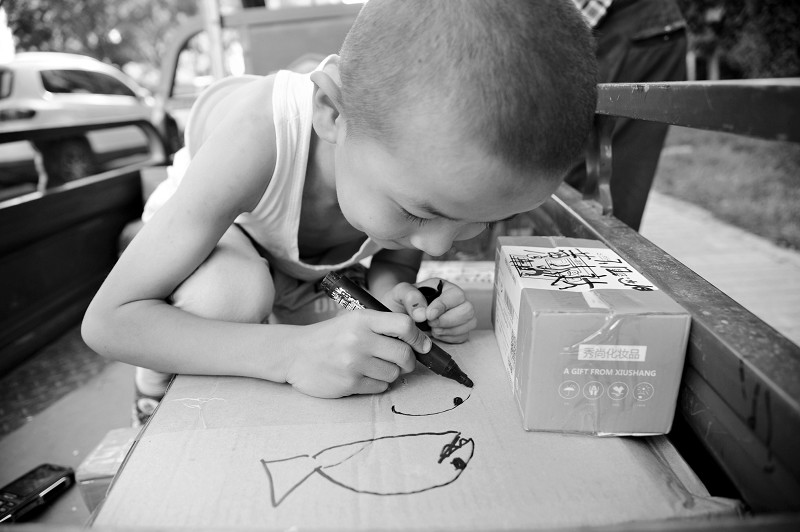 快遞員王貴生,今年49歲,靜樂(lè)人,右臂殘疾。7歲的兒子小志偉放暑假后,就跟著他每天穿梭在太原的大街小巷送快遞。爸爸負(fù)責(zé)拆件、分揀,兒子負(fù)責(zé)打電話通知客戶。 (胡續(xù)光 攝)