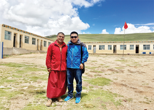 在青海玉樹念經(jīng)湖小學慈善捐贈后與校長合影留念