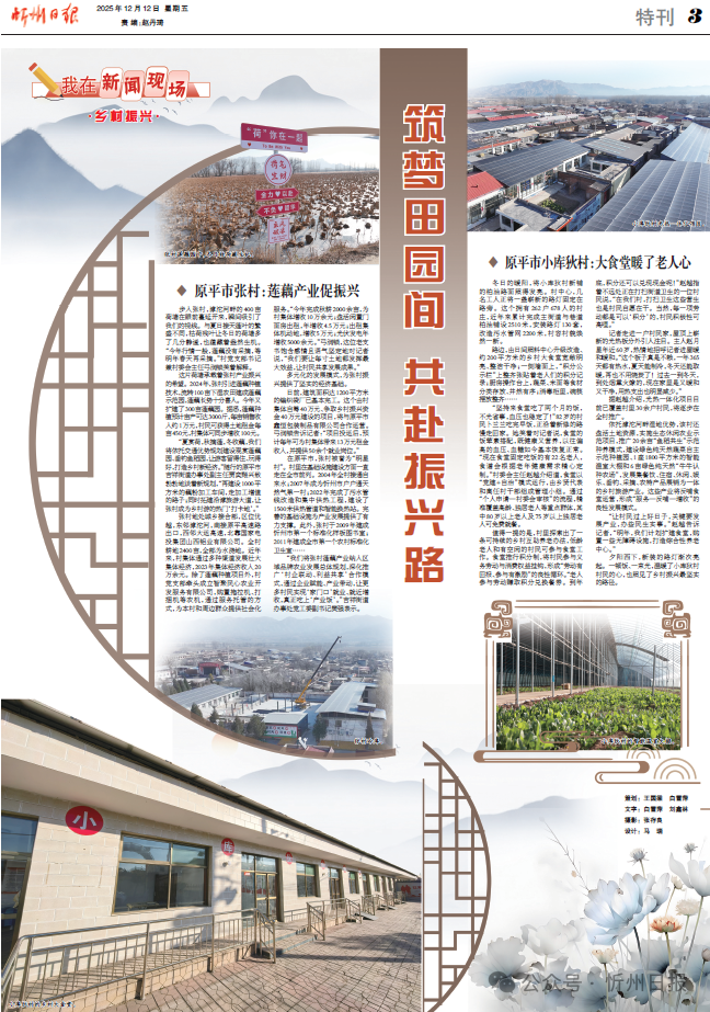張村地處城鄉(xiāng)接合部,區(qū)位優(yōu)越,東鄰滹沱河,南接原平高速路出口,西鄰大運高速,北靠國家電投集團山西鋁業(yè)有限公司。全村耕地2400畝,全部為水澆地。近年來,村集體通過多種渠道發(fā)展壯大集體經(jīng)濟,2023年集體經(jīng)濟收入20萬余元。除了蓮藕種植項目外,村黨支部牽頭成立智聚民心農(nóng)業(yè)開發(fā)服務有限公司,購置拖拉機、打捆機等農(nóng)機,通過服務托管的方式,為本村和周邊群眾提供社會化服務。“今年完成秋耕2000余畝,為村集體增收10萬余元;盤活閑置門面房出租,年增收4.5萬元;出租集體機動地,增收5萬元;光伏發(fā)電年增收5000余元?!惫瓭欐i,這位老支書飽含感情且語氣堅定地對記者說,“我們要讓每寸土地都發(fā)揮最大效益,讓村民共享發(fā)展成果。”