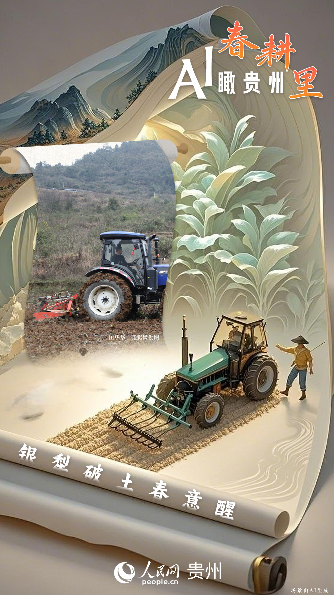春回大地,萬物復(fù)蘇,黔地山川間正上演著一場生機(jī)勃勃的春耕盛景。傳統(tǒng)農(nóng)耕與現(xiàn)代科技在這里交織,描繪出一幅幅充滿希望的畫卷。 春耕不僅是農(nóng)時的序曲,更是科技與土地對話的現(xiàn)場。在貴州這片喀斯特地貌與民族文化交織的土地上,春耕正經(jīng)歷一場靜默的變革:無人機(jī)掠過千年梯田,算法解析紅壤墑情,覆膜機(jī)織就“智能外衣”,而彎腰勞作的農(nóng)人,依然用繭手傳遞著古老農(nóng)耕文明的溫度。 本期跟隨AI一起描繪貴州春耕里的故事。