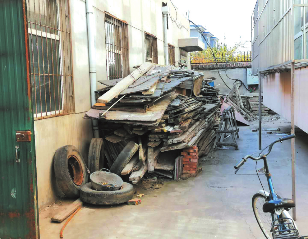 堆放在晨光家園小區(qū)樓前的木板。